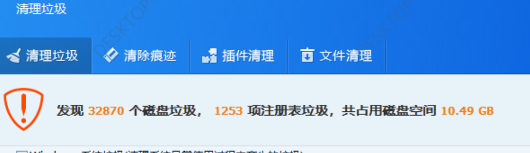 这个过程不到2分钟,结果...,我惊呆,居然发现32870 个磁盘垃圾,1253 项注册表垃圾,共占用磁盘空间 10.49 GB,赶紧清理。