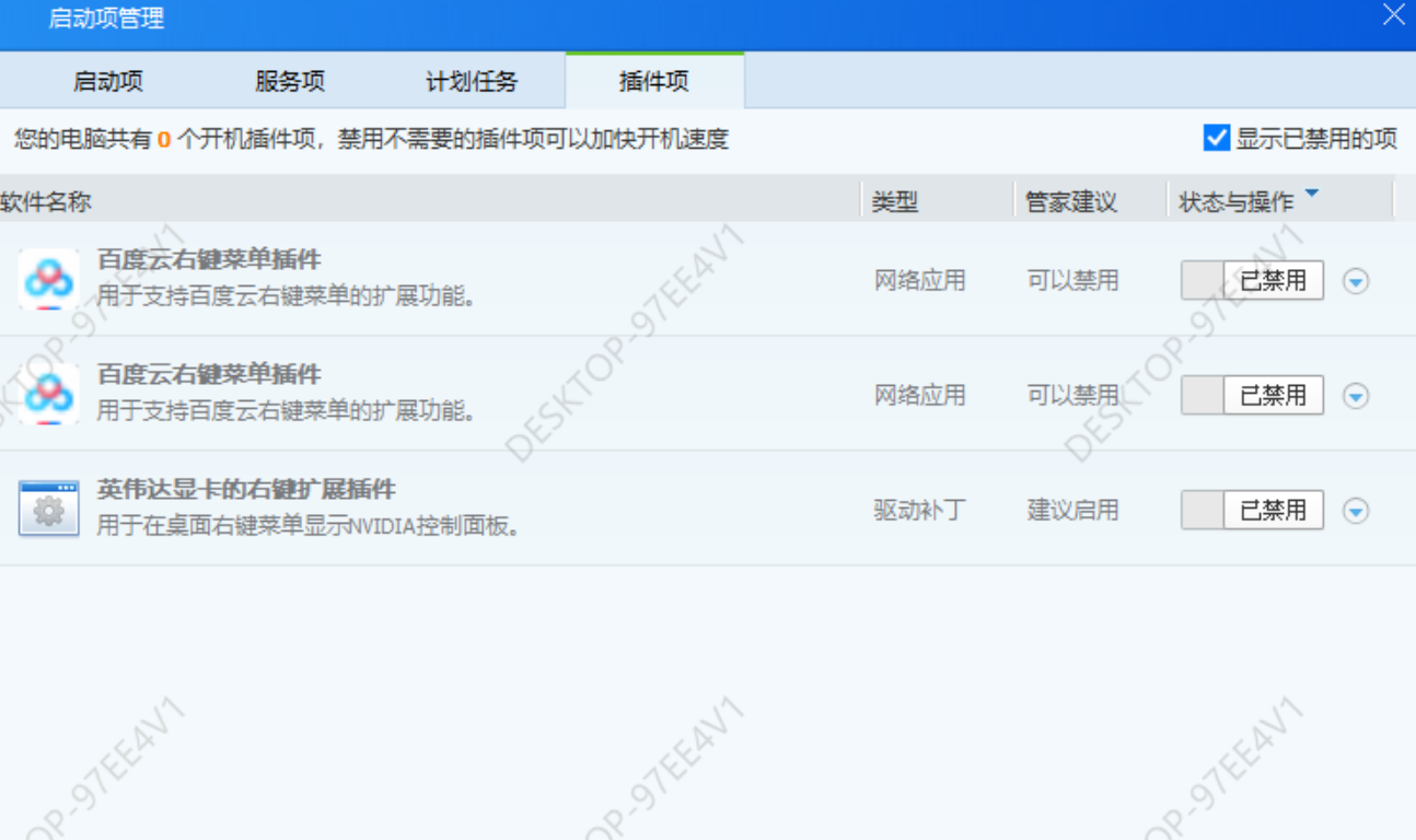 我发现在插件项中可恶的百度云居然还有,我之前都卸载了在个软件,我服了,先都禁用掉,你也快看看你的。