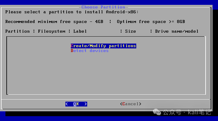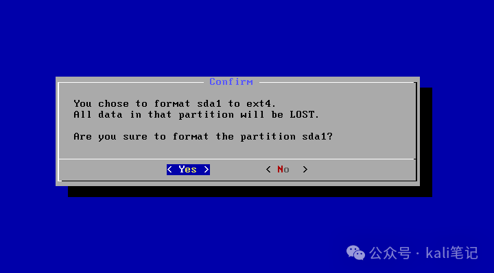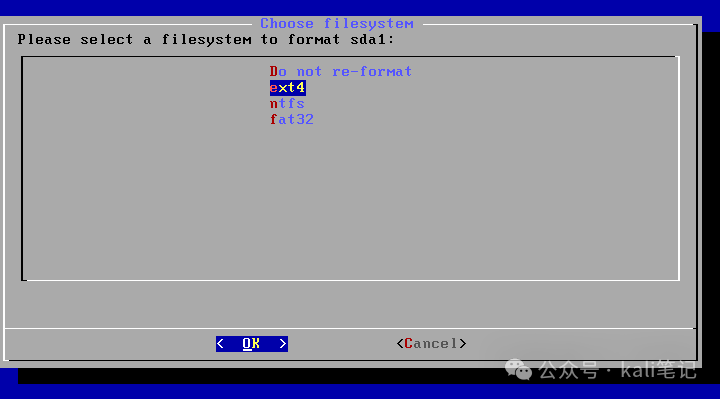完成后,选中Quit回车,退出分区 选择 “sda1”,即第一块硬盘的第一个分区,然后用“Tab”键选中“OK” 并选择ETX4后回车