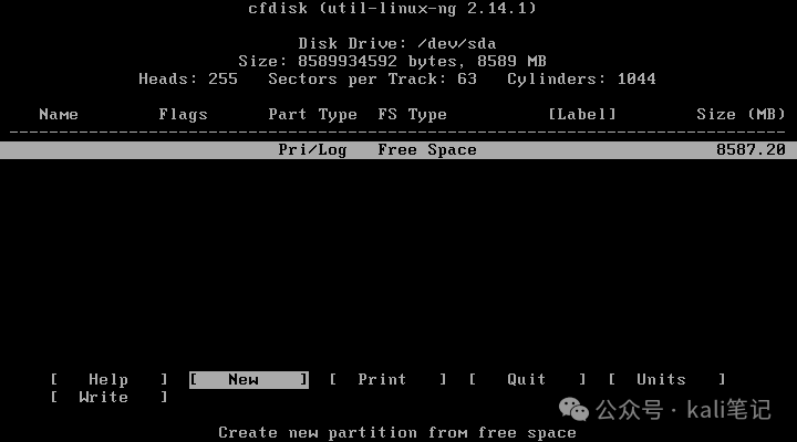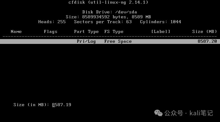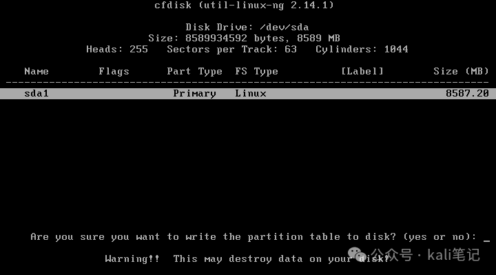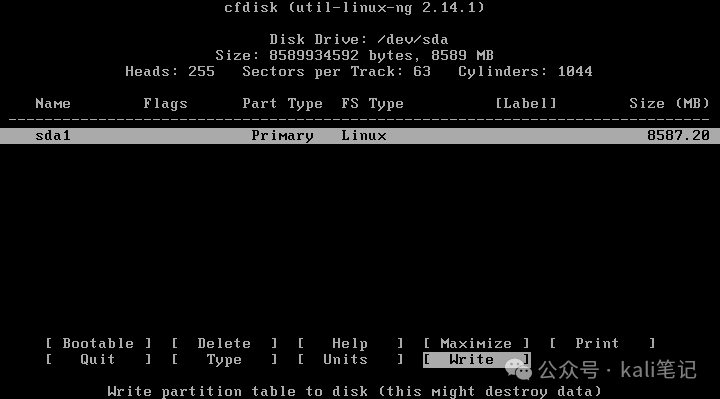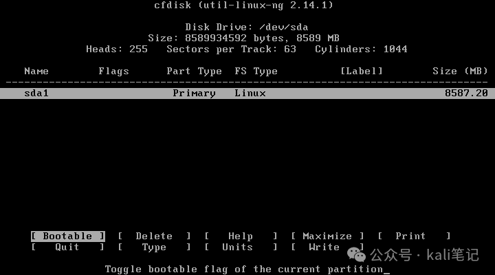 激活分区,写磁盘引导信息,选择“Bootable”然后回车,“sda1”的Flags就是“Boot”。