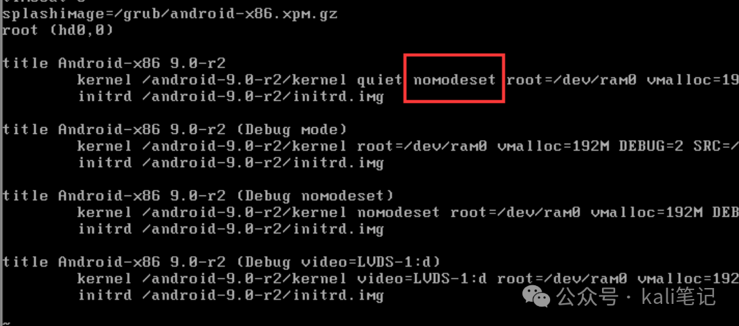 修改/mnt/grub/menu.lst, 加入nomodeset选项