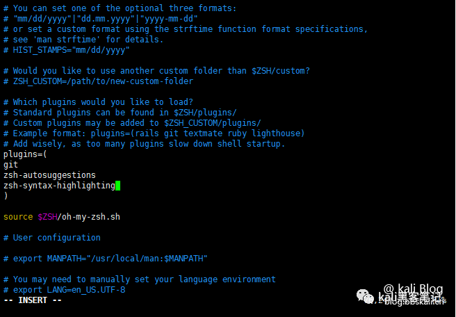 接下来,我们需要将下载的两个插件放到zsh的配置文件中去。编辑.zshrc文件的plugins=()选项,然后source .zshrc