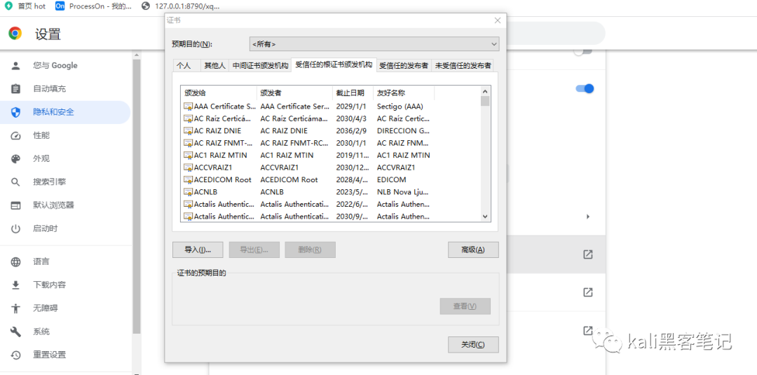 接着我们需要在浏览器上导入证书,以谷歌浏览器为例:点击设置-安全和隐私设置-安全-管理证书: