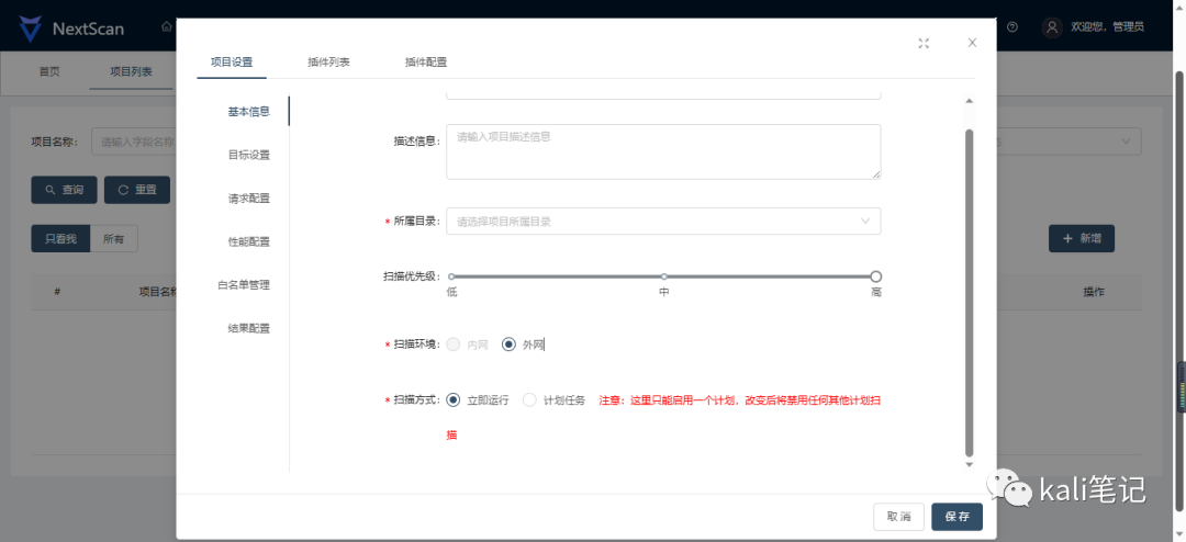 项目管理->项目列表->新增按钮,可以选择自定义插件,或者根据插件模板创建扫描任务。