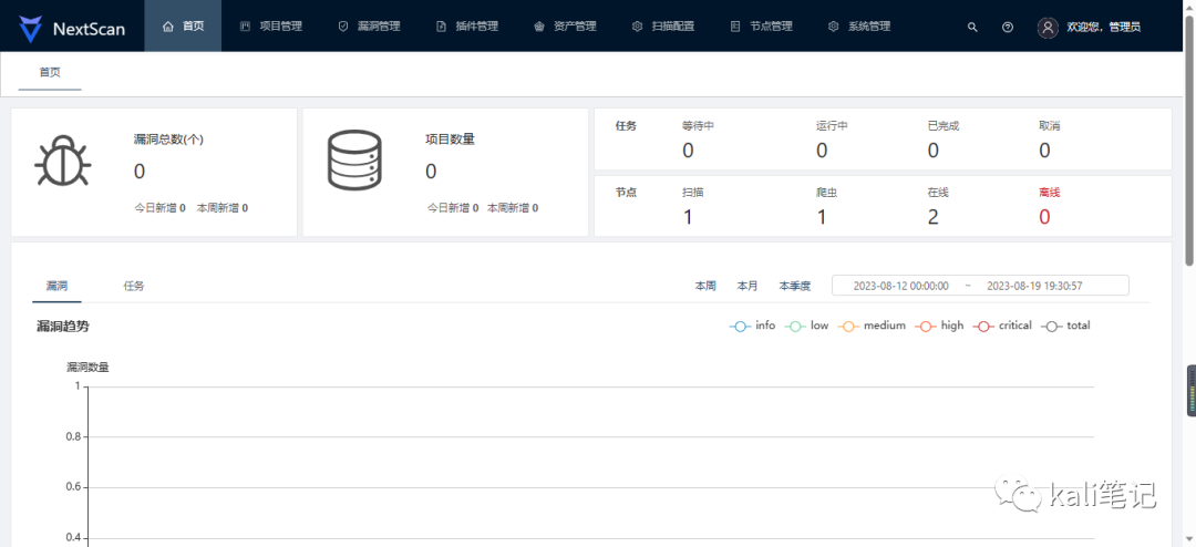 NextScan是一款适合企业需求的漏洞扫描平台,基于go语言编写,采用分布式架构,由Server,Agent,Web三个部分组成。拥有信息采集、漏洞扫描、漏洞管理、POC管理、资产管理等功能,支持主动、被动多种扫描模式,支持多种数据来源,支持扫描Web漏洞、主机类漏洞等。