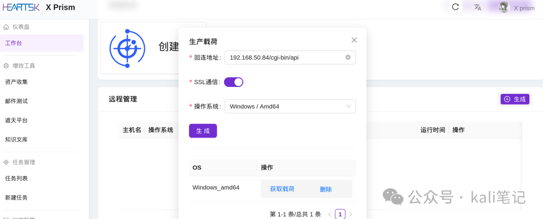 初次登录后,请先修改密码,不然不出来。一键生成 Agent,点击获取载荷即生成客户端。