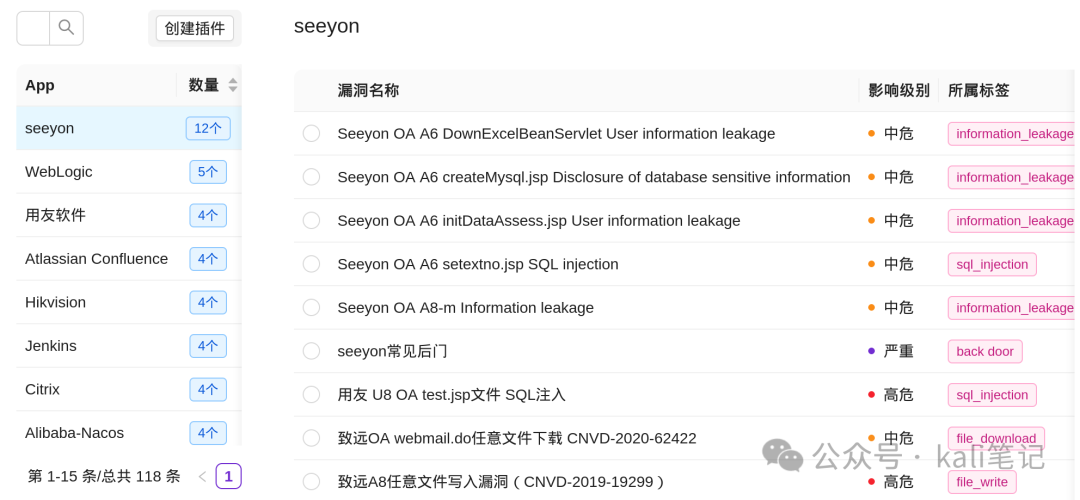 根据需要,可以编写插件。目前有118个插件,包含了最新的漏洞。