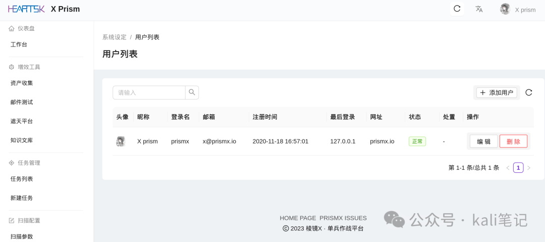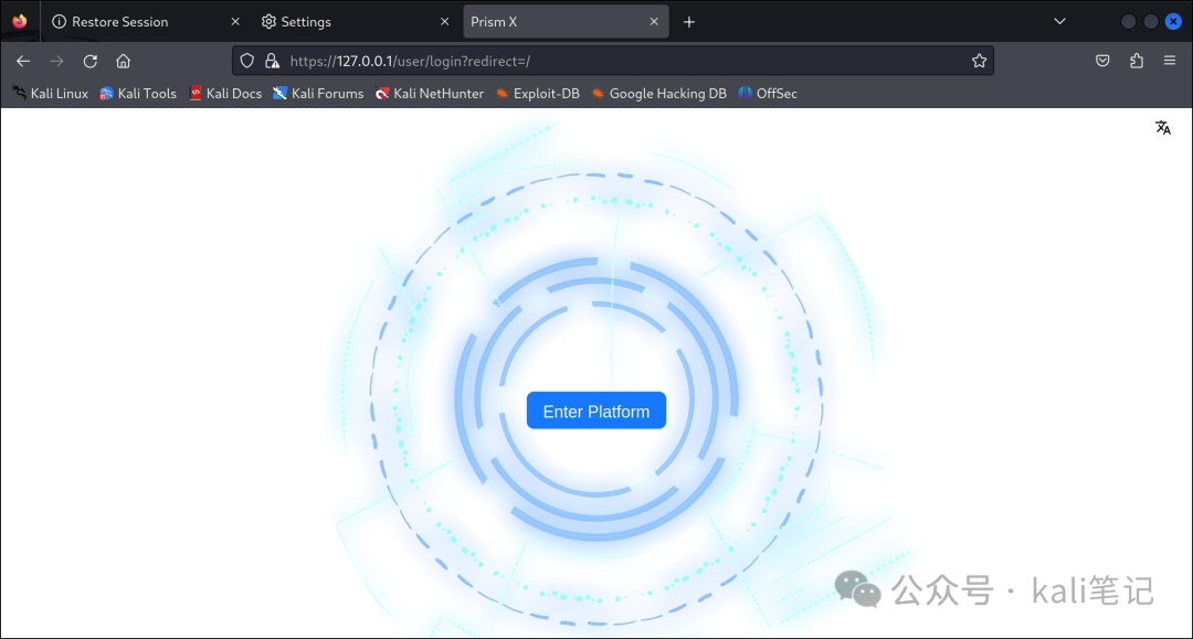 命令之后访问https://127.0.0.1:443即可进入登录页,使用 -port 参数可指定端口。系统默认账号prismx/prismx@passw0rd
