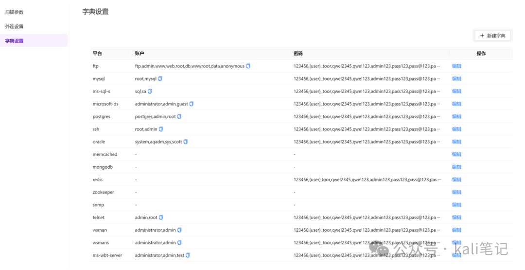 系统内置默认账户、密码组合。如果密码列里出现{user}占位符,则会被替换成用户名。