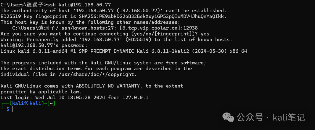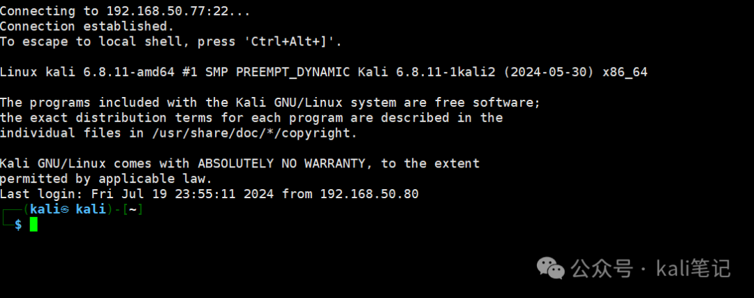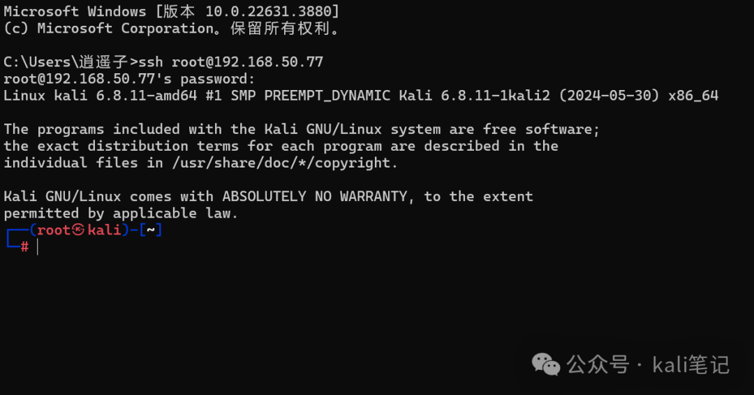 需要注意的是,在kali中默认root账号是无法登录的。我们可以用普通账号登录,如kali