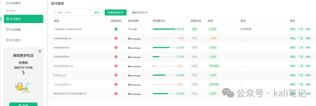 如果你有很多HTTPS证书需要管理。这款工具你值得尝试。免费版仅支持5个域名,对普通用户来说足够了。当然,处置此外,宝塔面板也可以自动续签,但是常出现BUG,在执行上面命令后,宝塔面板也会自动更新证书时长。