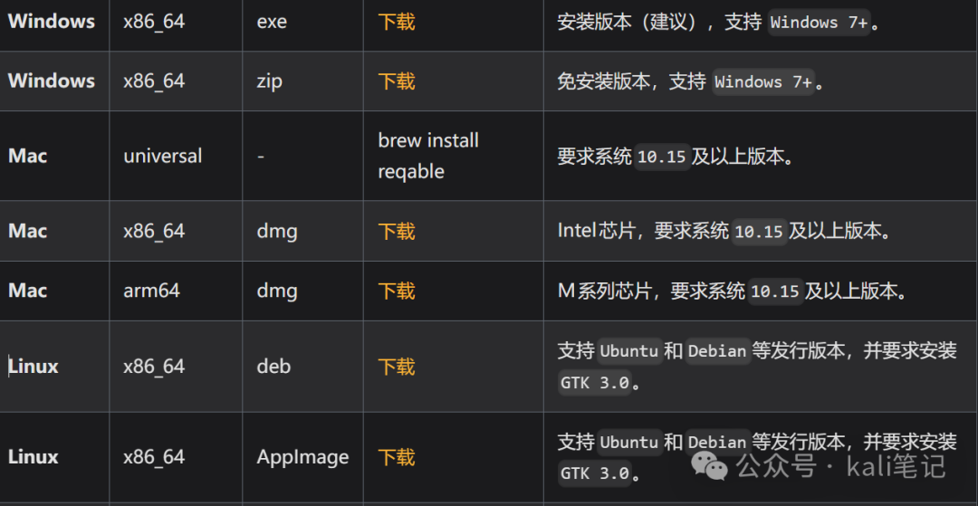 本文以Kali安装为例。Windows平台双击安装包就行了。从官网下载安装包 https://reqable.com/zh-CN/