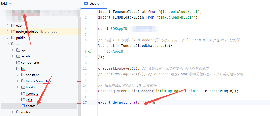 创建一个 chat.ts的文件,放到项目中,进行SDK的初始化,同时导出 chat ,可以看到这里是没有使用IM的登录方法的。登录的方法是放到了登录页面通过导出的 chat 调用的。