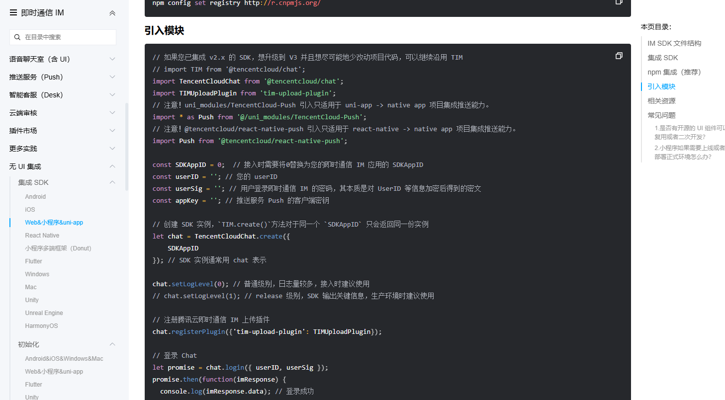下文是IM的官网文档,指引如何集成IMSDK,并且初始化。