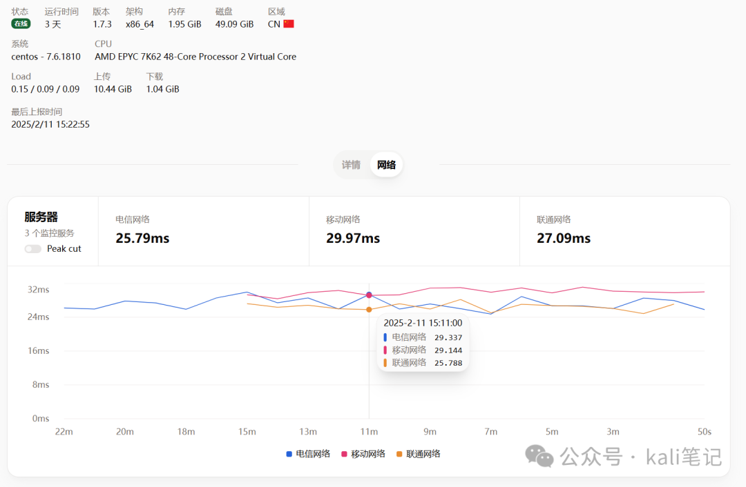 我们可以哪吒v1直接显示服务器网络与三网之间的延迟情况。本文以GS为例。