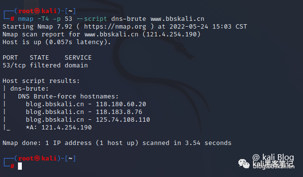 nmap -T4 -p 53 --script dns-brute www.bbskali.cn