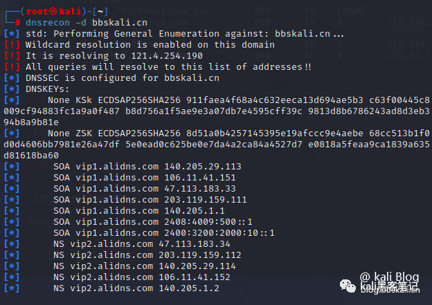 枚举主机和子域。dnsrecon -d bbskali.cn