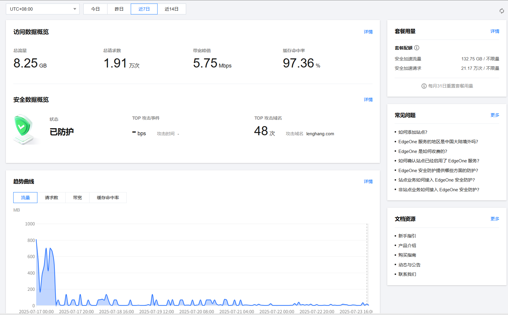 EdgeOne免费版提供了基础的 CDN加速、DDoS防护 和 HTTPS支持,对于流量适中的个人博客、小型项目站来说完全够用。例如: