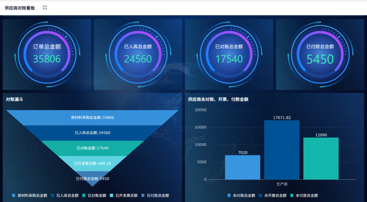 供应商对账看板用于展示与各供应商之间的对账情况,包括未结算款项、已支付款项、欠款额度等。这些数据帮助财务人员及时了解对账状态,并有效管理供应商支付流程。