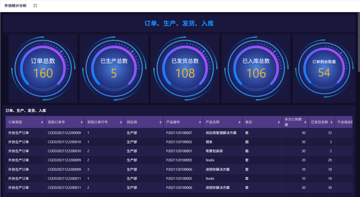 外协统计分析功能模块主要展示外包或外协生产的数据,帮助企业有效管理外协业务,并优化外协流程。