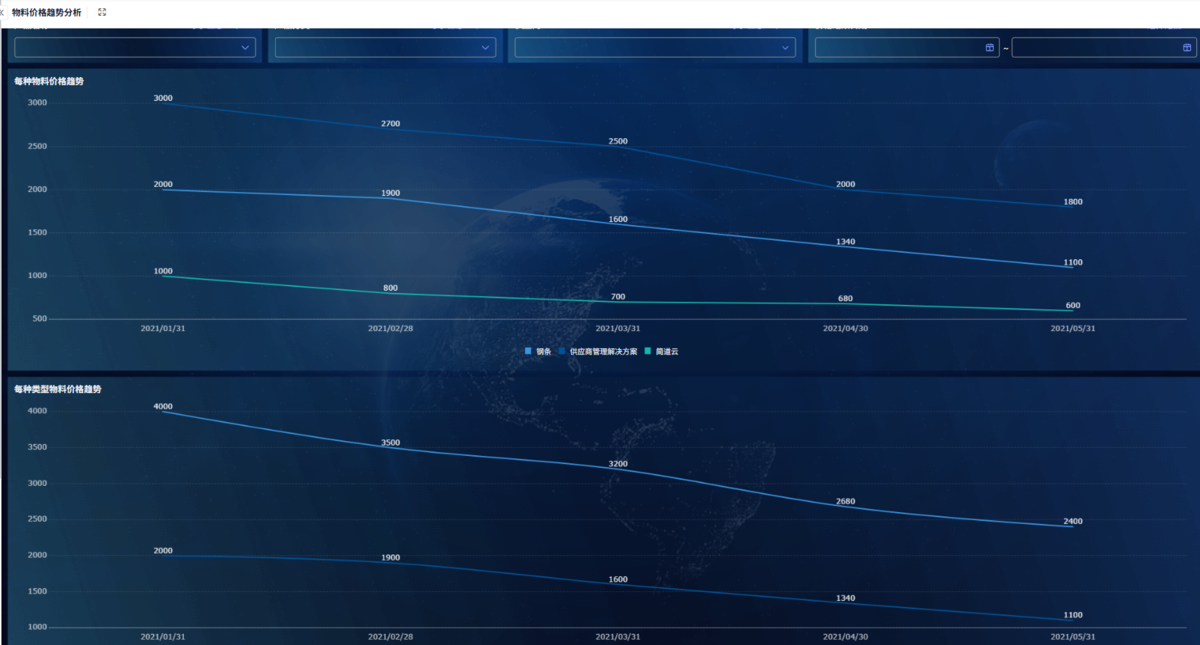 物料价格趋势分析功能帮助企业追踪物料价格的变动趋势,避免采购时因价格波动而产生不必要的损失。此模块可以通过图表展示价格变化,帮助决策者制定采购策略。