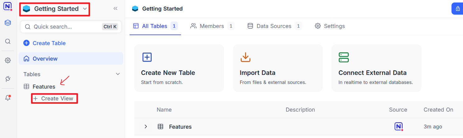应用内部已经有了一个默认的数据库叫做Getting Started,也可以通过上面的Create Base按钮创建新的数据库。