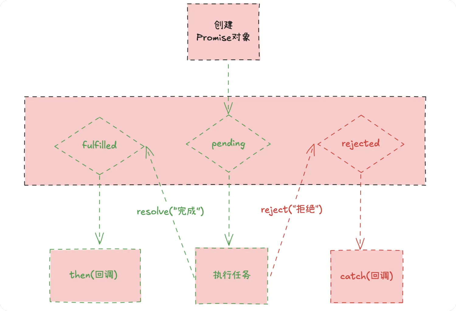 一旦 Promise 的状态改变,你可以使用 .then() 来处理成功的结果,使用 .catch() 来处理失败的原因。
