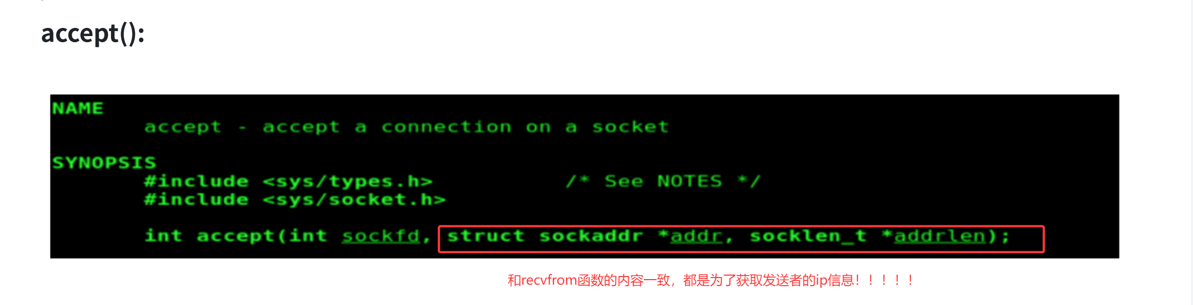 int sockfd = accept(_listensockfd, CONV(peer), &len);//sockfd来提供服务,而_listensockfd只提供建立链接和接收!!!