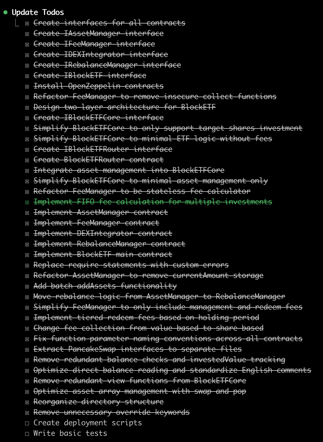 最直观的差异是:Claude 的输出更像是在跟一个有架构经验的人合作。它不会立刻跳进代码细节,而是先帮我梳理整体需求——确认目标、规划模块、建议接口,甚至整理出开发步骤。我只简单描述了一句:“我要做一个链上ETF,包括合约和前端,帮我从 0 到 1 搭建起来”,Claude 就立刻列出了一个清晰的 Todos 列表,然后按图索骥,一步步完成任务。这种“先规划、后执行”的模式,非常适合复杂工程,体验上更像是一个“远程技术合伙人”。