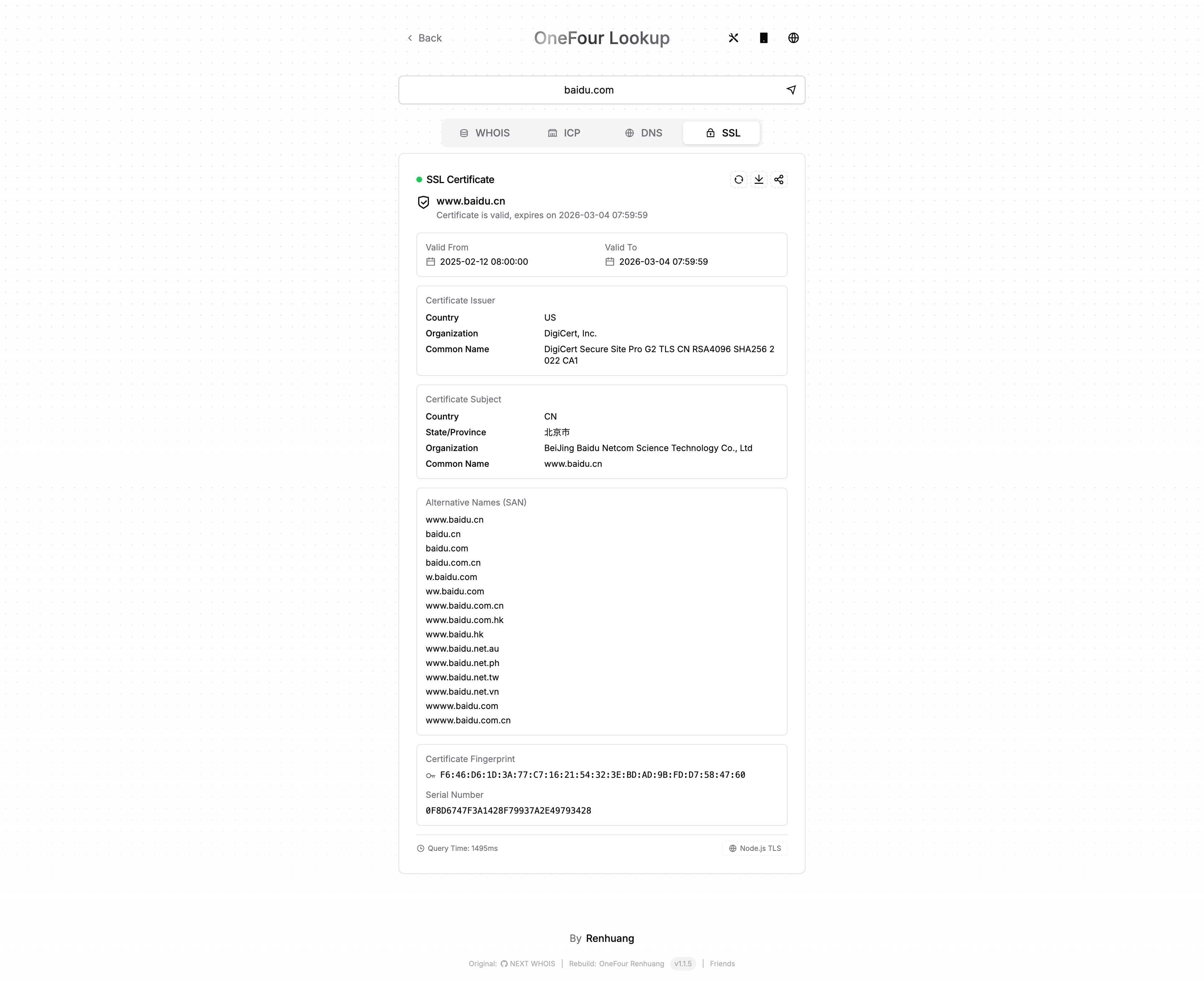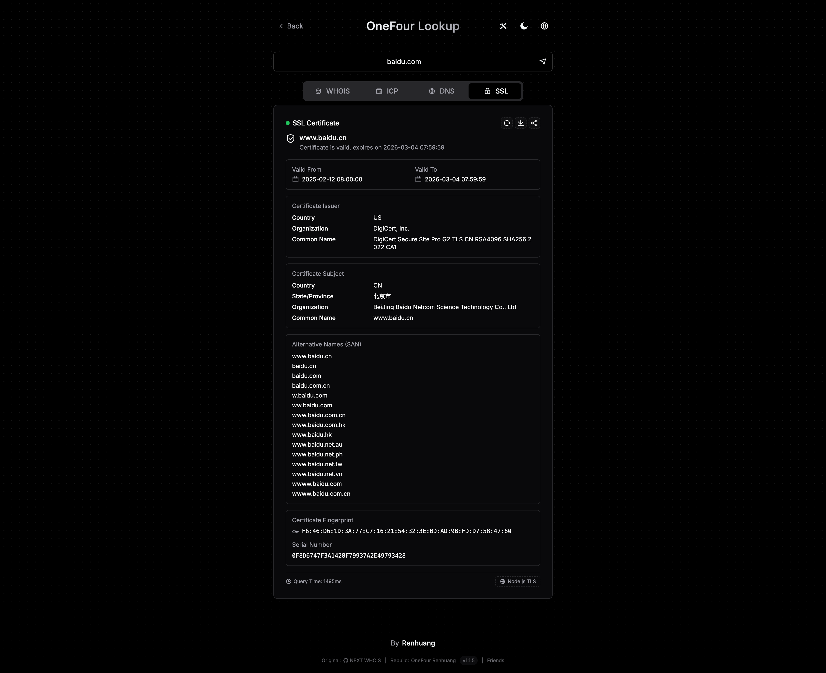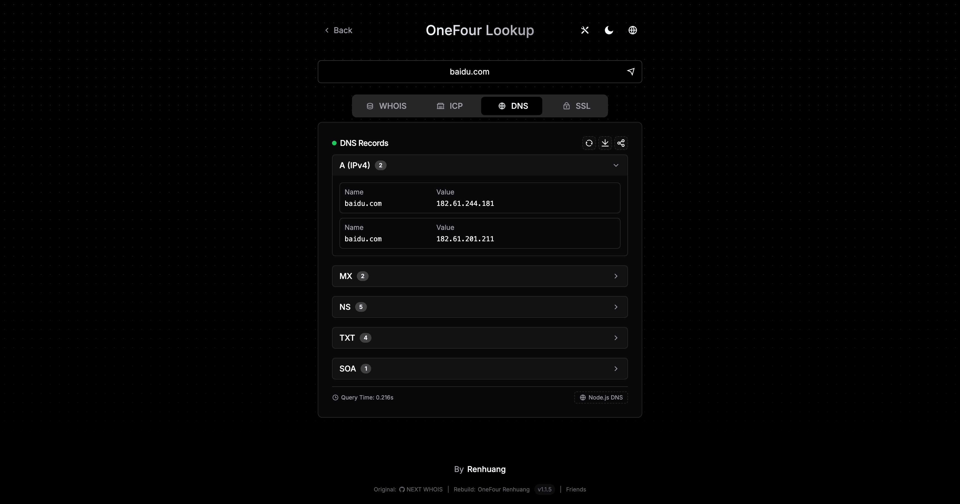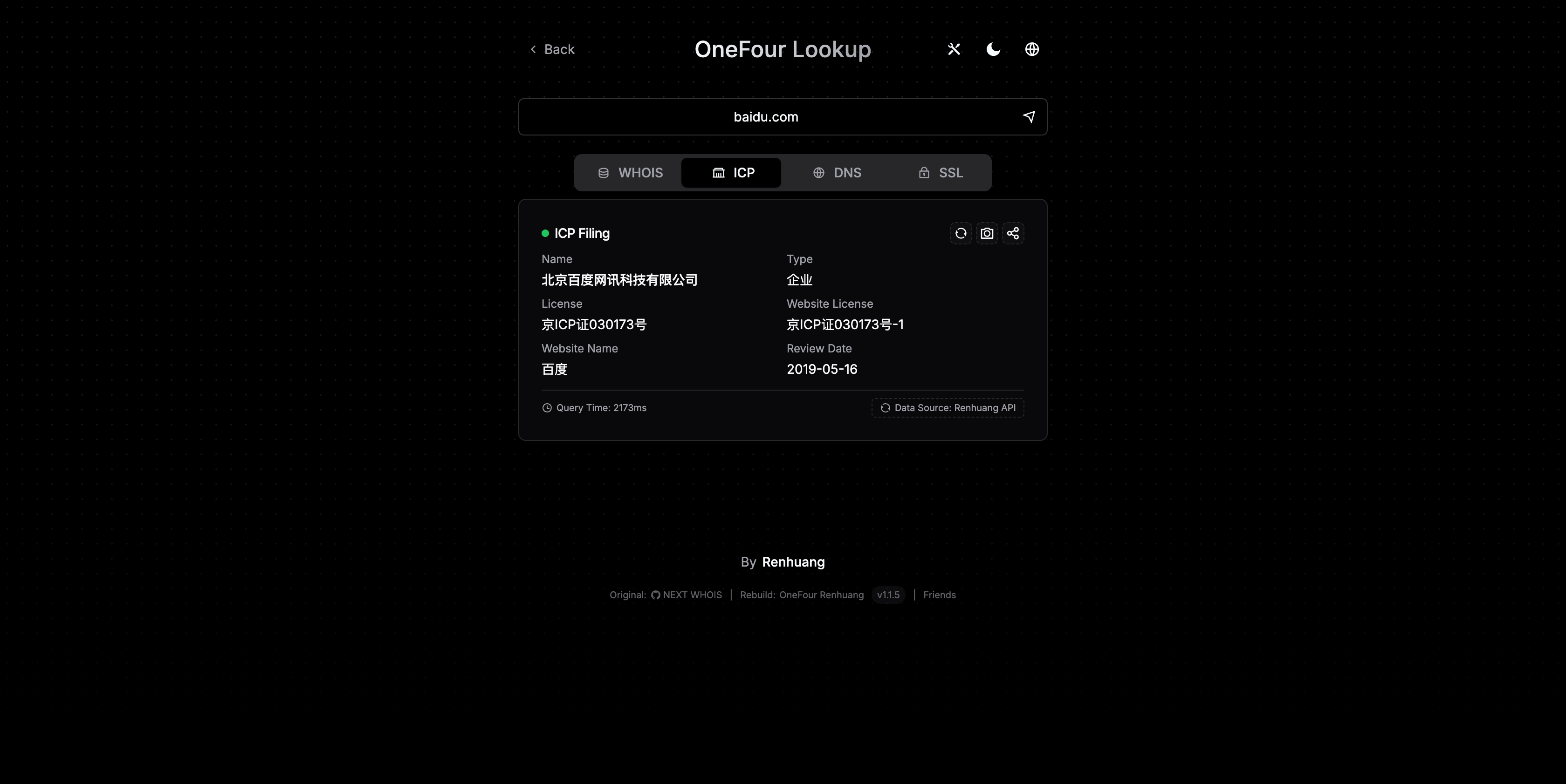 无论你是技术专家还是普通用户,OneFour 都能为你提供最专业、最便捷的 WHOIS 查询服务。现在就来体验这个强大的网络工具吧!