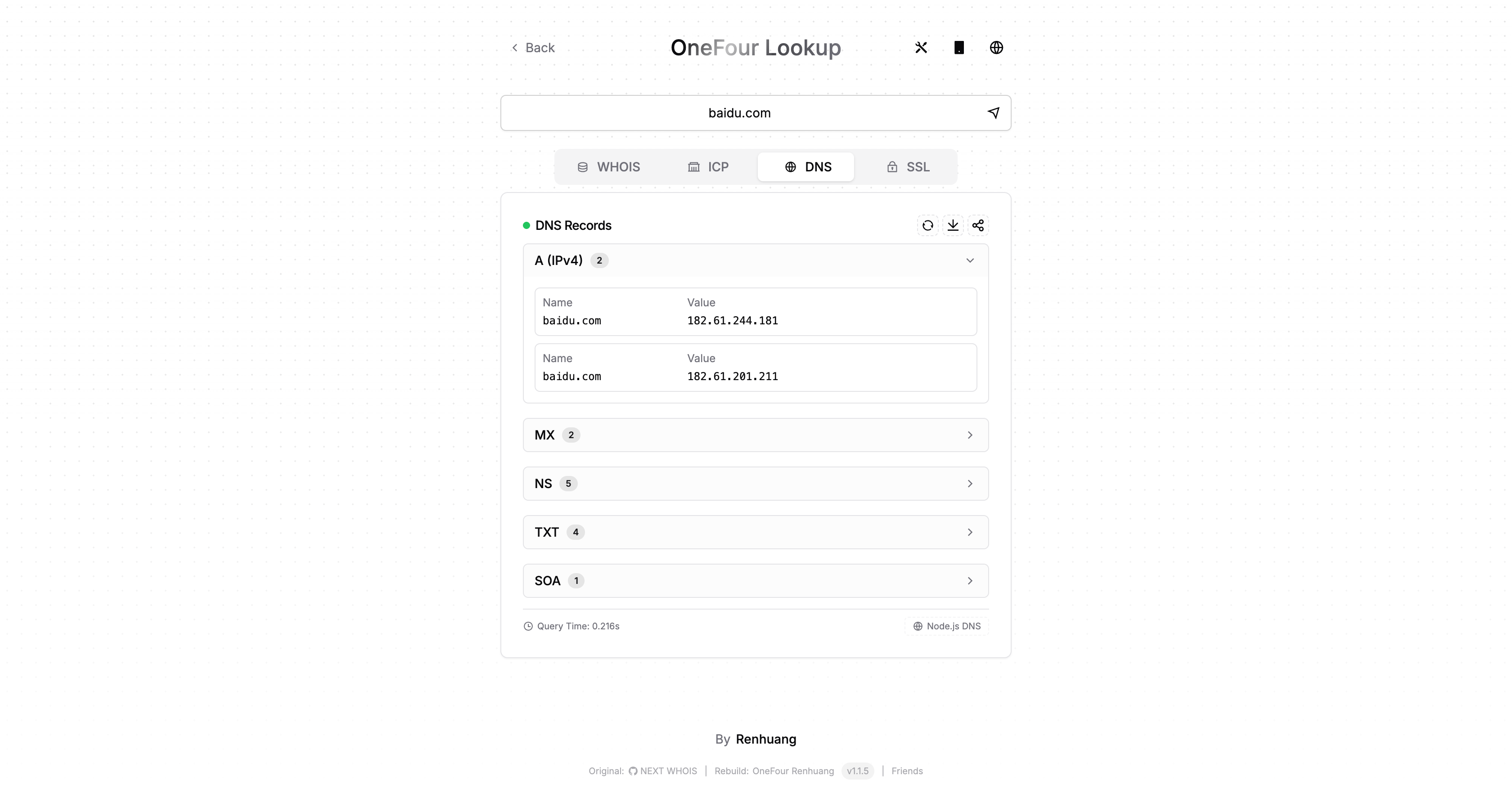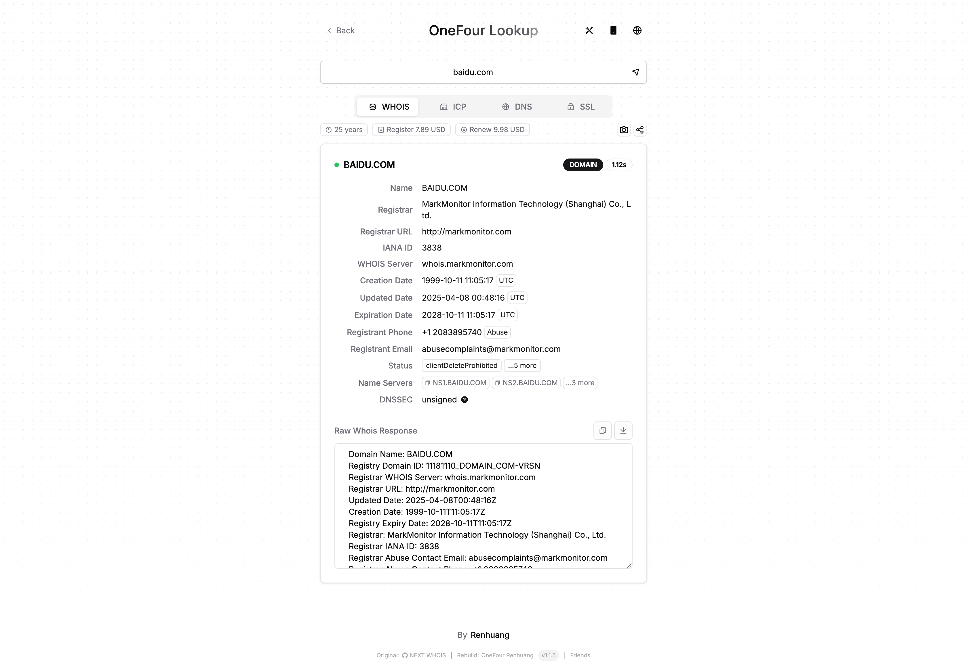 OneFour 是一个专业的在线 WHOIS 查询平台,让你能够轻松查询域名和 IP 地址的详细信息。无论你是域名投资者、网站管理员、网络安全专家,还是对某个网站感兴趣的普通用户,OneFour 都能为你提供准确、快速的查询服务。