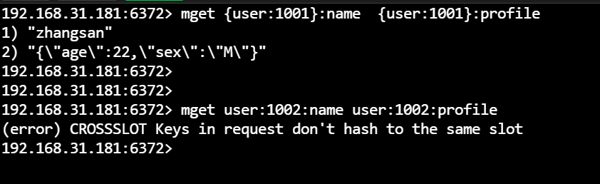 user:1001:orders{}:user:1001:name 和 user:1001:profile 可能落在不同的 Slot,无法用 MGET 批量查询。{}:plaintext复制{user:1001}:name {user:1001}:profile {user:1001}:orders{user:1001} 部分相同,Hash Slot 相同,可以一起查询:bash复制MGET {user:1001}:name {user:1001}:profile {user:1001}:orders例如如下的例子: