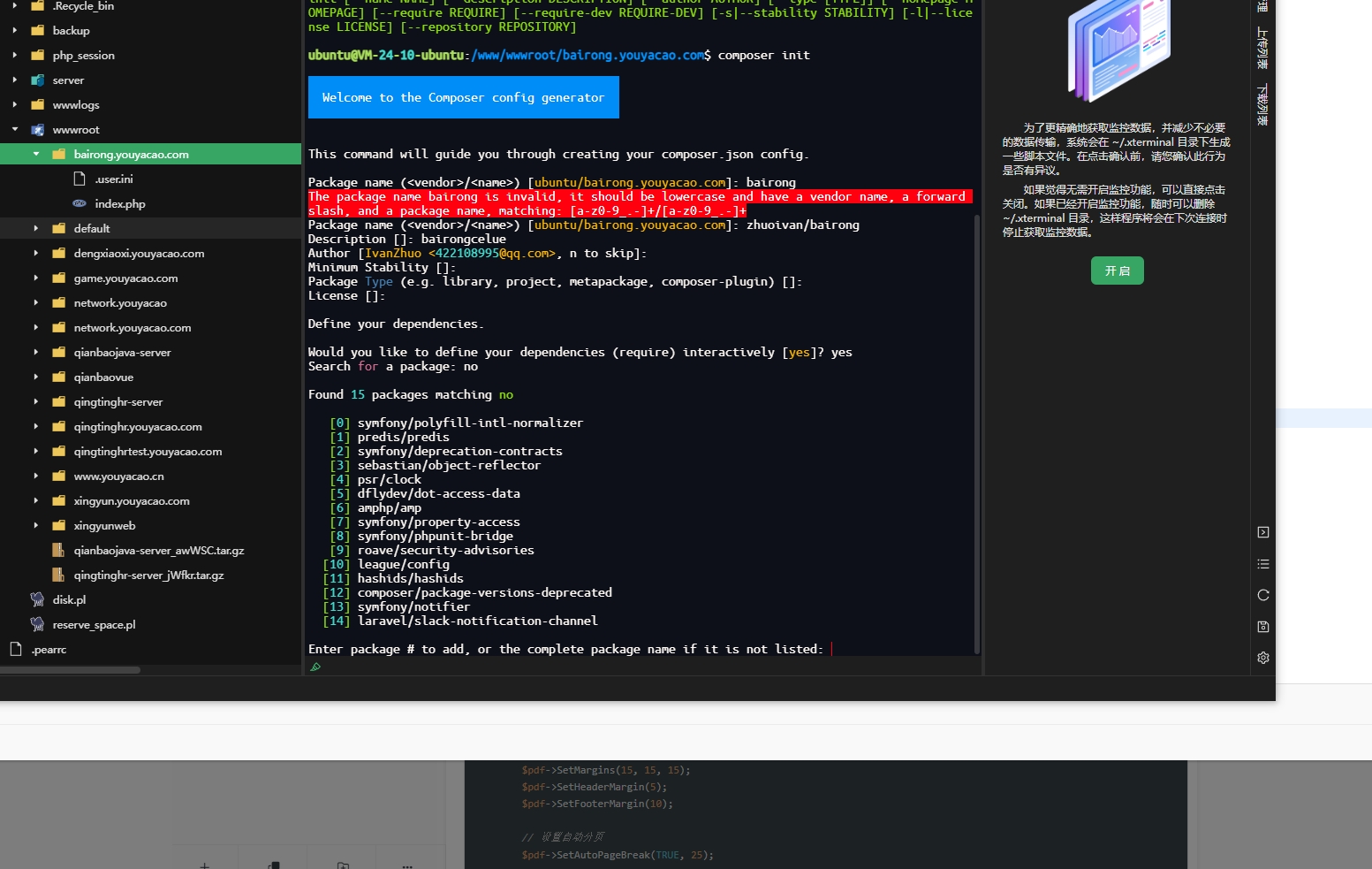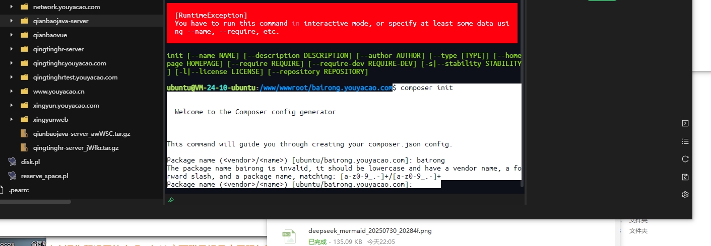 Package name (<vendor>/<name>) [ubuntu/bairong.youyacao.com]: bairong The package name bairong is invalid, it should be lowercase and have a vendor name, a forward slash, and a package name, matching: [a-z0-9.-]+/[a-z0-9.-]+ Package name (<vendor>/<name>) [ubuntu/bairong.youyacao.com]: