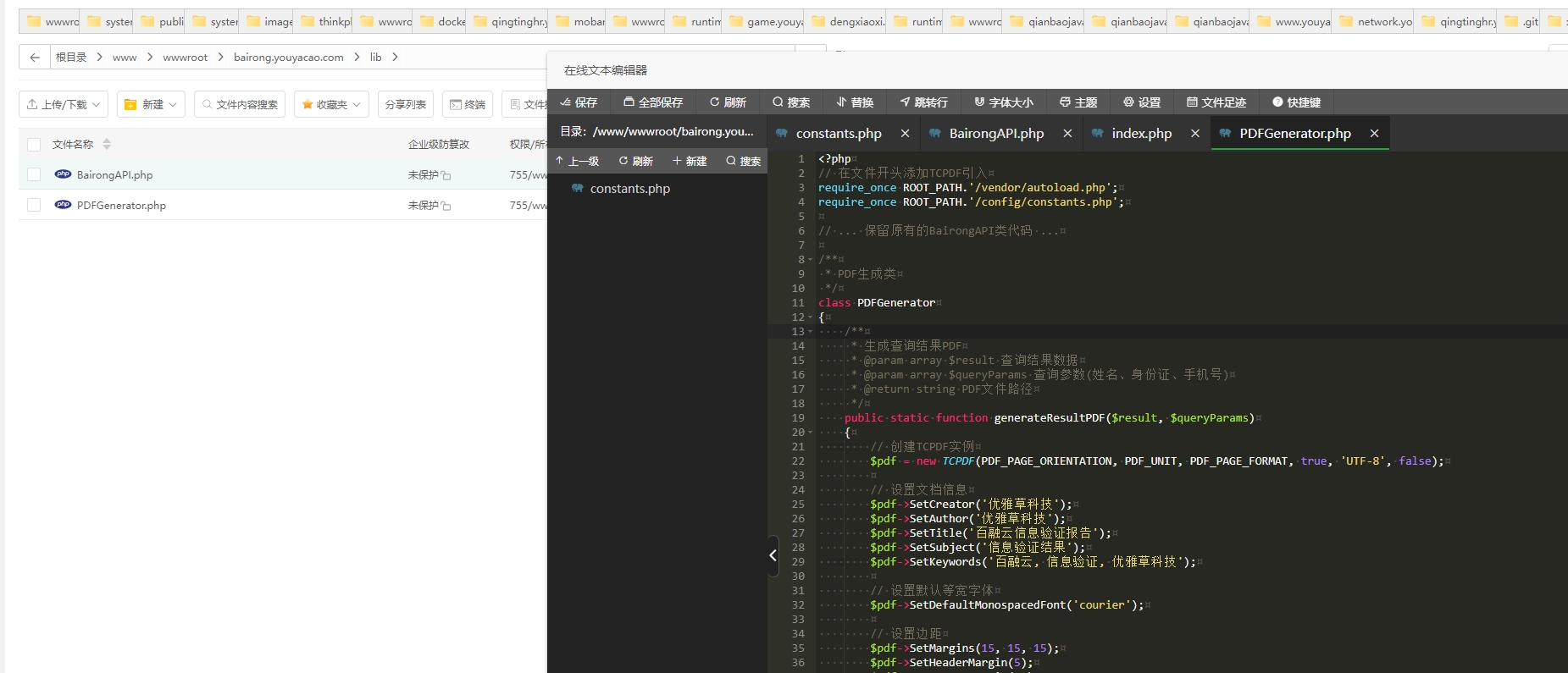 cd myprojectcomposer require tecnickcom/tcpdfmkdir -p config lib temp assets/{css,js,images}constants.php放入config/目录assets/images/目录BairongAPI.php放入lib/目录PDFGenerator.php放入lib/目录chmod -R 755 temp/index.phpvendor/tecnickcom/tcpdf/fonts/目录中选择或添加新字体temp/目录有写入权限完整修改后 我们成功可以访问了