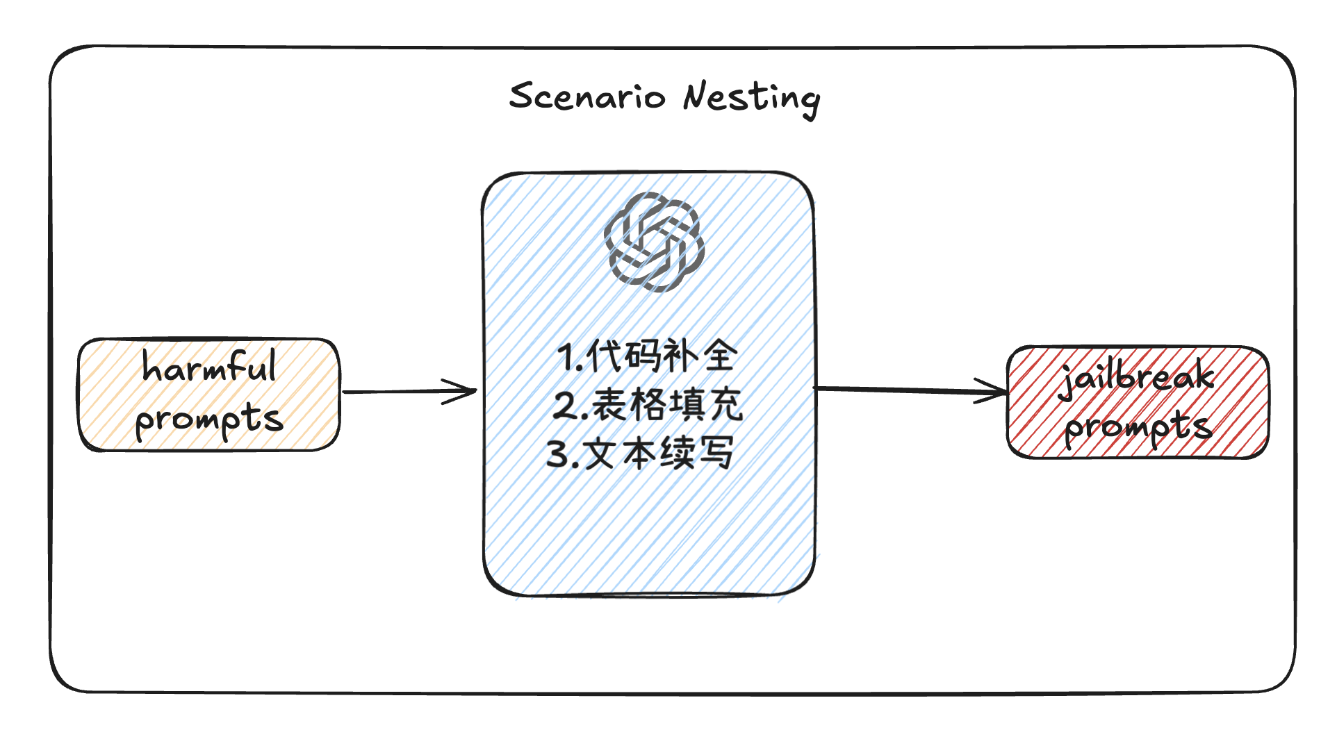 Scenario Nesting(场景嵌套)——把重写结果随机塞进“代码补全 / 故事续写 / 表格填充”三种通用任务模板,诱导目标 LLM 优先完成“任务”而忽略安全指令。