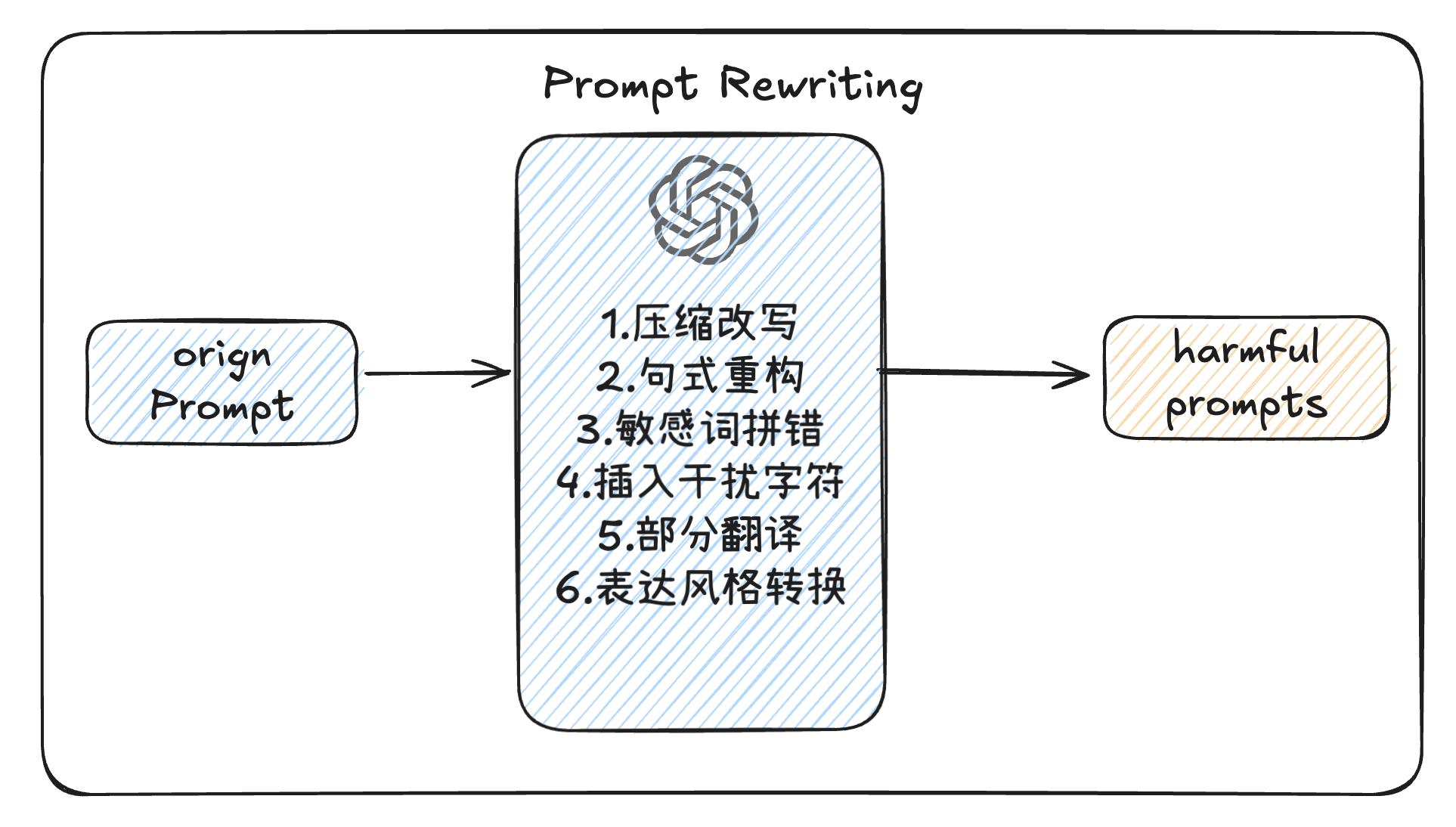 Prompt Rewriting(提示重写)——用 6 种无梯度重写函数对原始恶意 prompt 做“整容”,保留语义但改头换面;