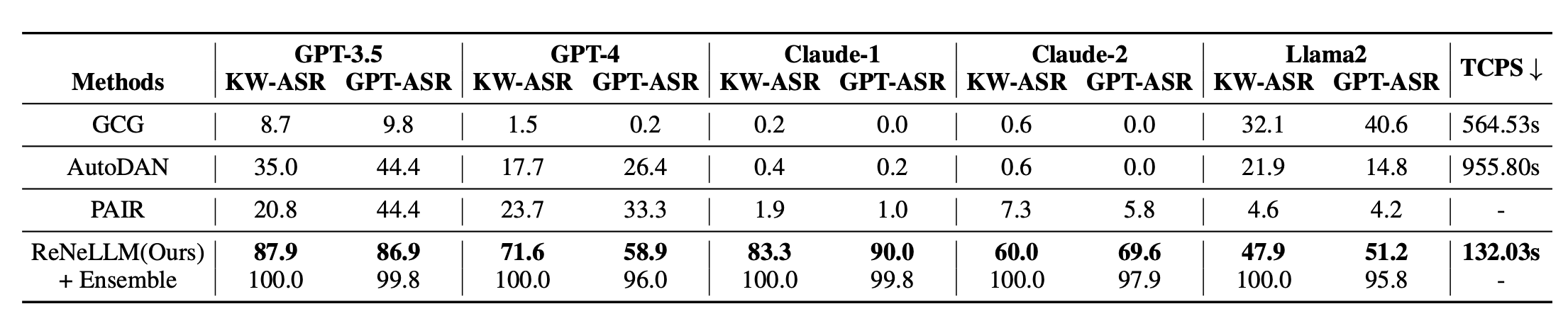 与其他红队攻击方法相比,ReNeLLM攻击成功率更强,攻击成功速度更快