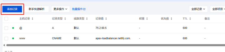 添加@记录,记录值指向Netlify给你的IP地址:75.2.60.5。