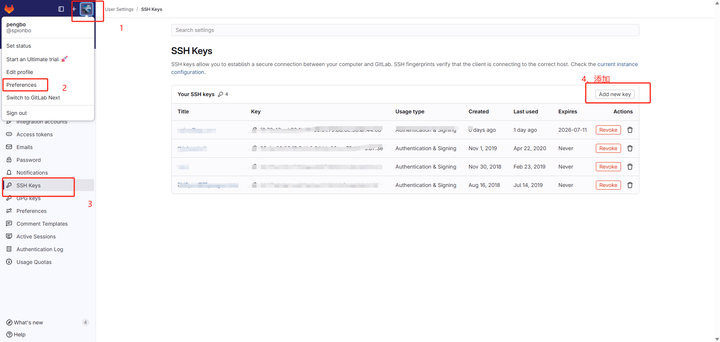 可使用https或ssh方式拉取,我这里用的是ssh方式,这个需要在gitlab上生成一个ssh key,然后复制到本地,也可以本地生成,然后在gitlab上添加,如下图: