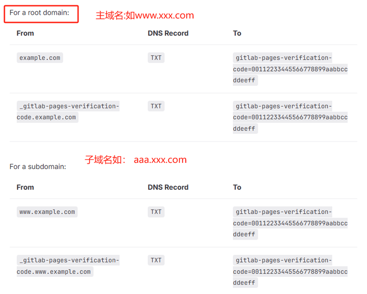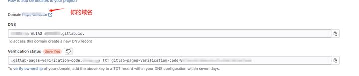 来到Pages Domain新页面,它便是要求你在你的域名 DNS 添加下列Record(记录),以此来验证你添加的域名所有权。