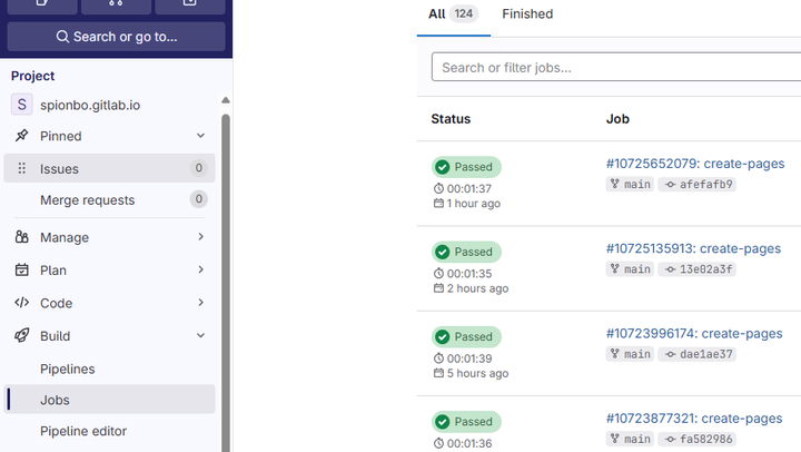 完成推送后,访问你的项目主页,如果看到passed的图标,就表示构建成功了,访问https://username.gitlab.io/ 就可以看到自己刚刚建立的博客了。