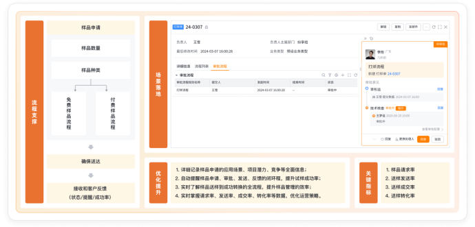 在化工/新材料行业,企业精准把握客户需求、巧妙设计产品、精细生产制造以及高效发送样品和收集反馈,这一系列环节构成了业务成功的基础。每个环节都依赖干销售、方案设计和技术实施这三个核心部门的紧密协作和无缝沟通。销售团队需要深入理解市场和客户的具体黑求,并将这些需求准确地传达给方案设计团队。方案设计团队则根据这些需求,匠心独运地设计出满足客户期望的样品。随后,技术实施团队以精益求精的态度,确保样品的生产制造过程严格遵守质量标准。