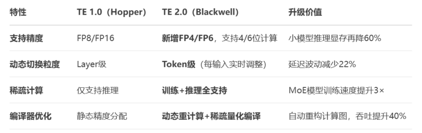 TE 2.0对比1.0,特性上更加强大;训练时显存占用更少、单卡吞吐量更大;推理时延时更低,能效更强。
