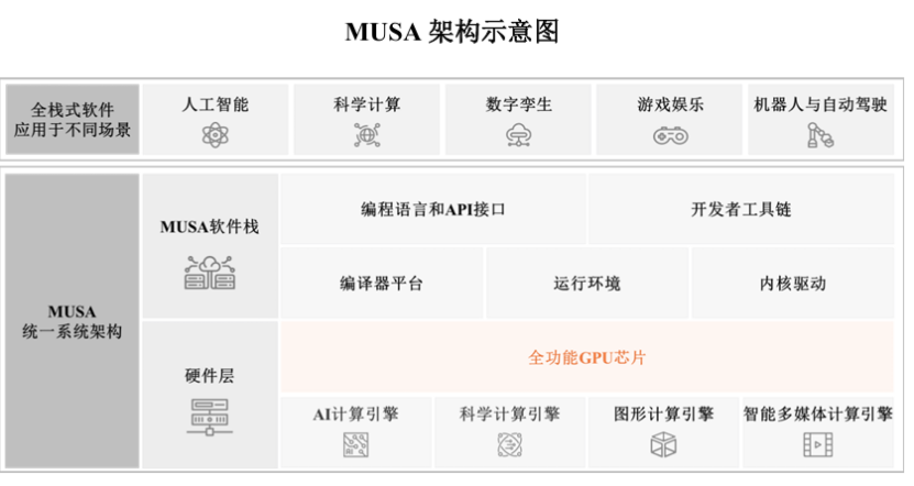 (2)MUSA架构涵盖统一的芯片架构、指令集、编程模型、软件运行库及驱动程序框架等关键要素。