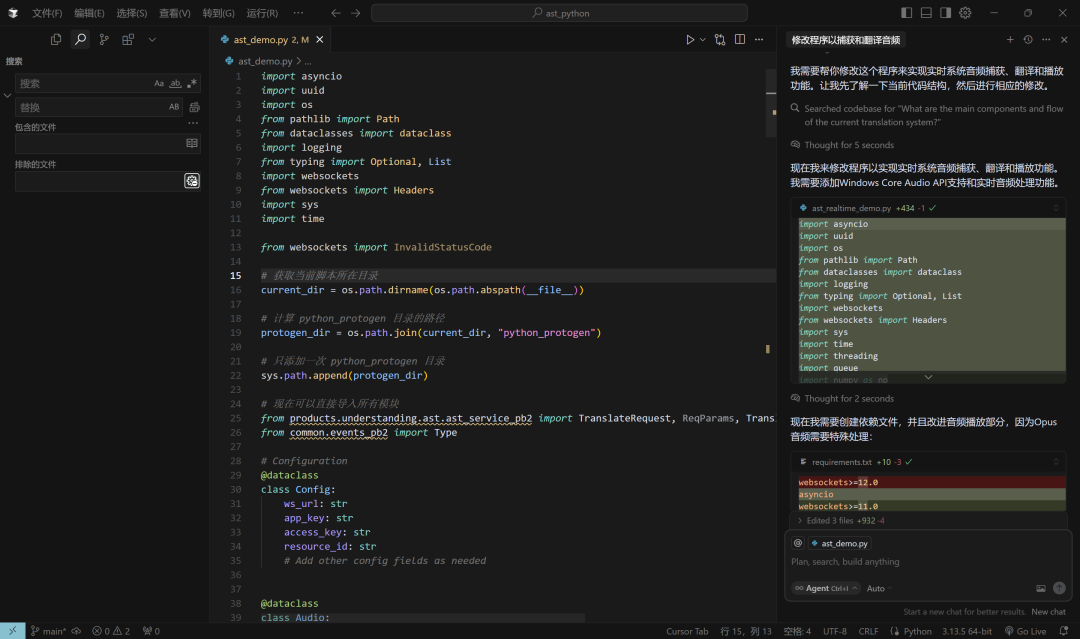我这就下载了豆包官方的Python示例代码,填了密钥信息,在电脑上跑了一遍,确实能运行。但是看了代码才发现,这玩意确实只是个示例,只能把一个本地的音频文件翻译成另一个语言,然后保存成文件。