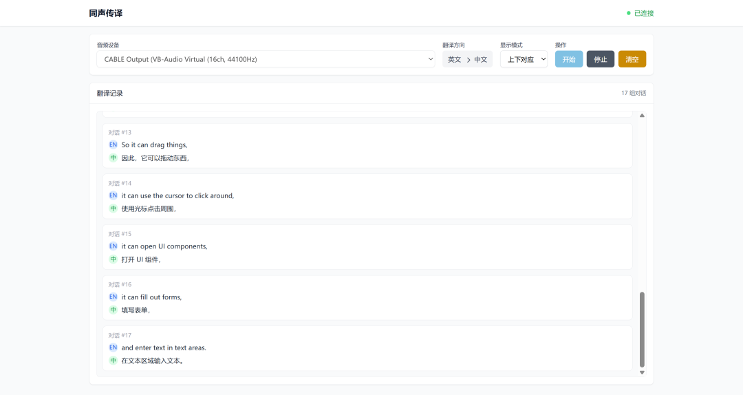 我打开了一个英文的AI发布会录播,然后启动我的程序。当那个陌生的英语声音消失,取而代之的是流畅的中文翻译时,我真的有种终于把这个破事给搞定了的成就感。