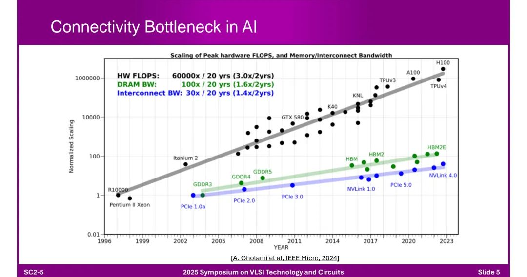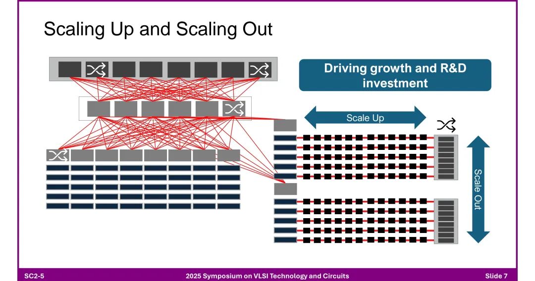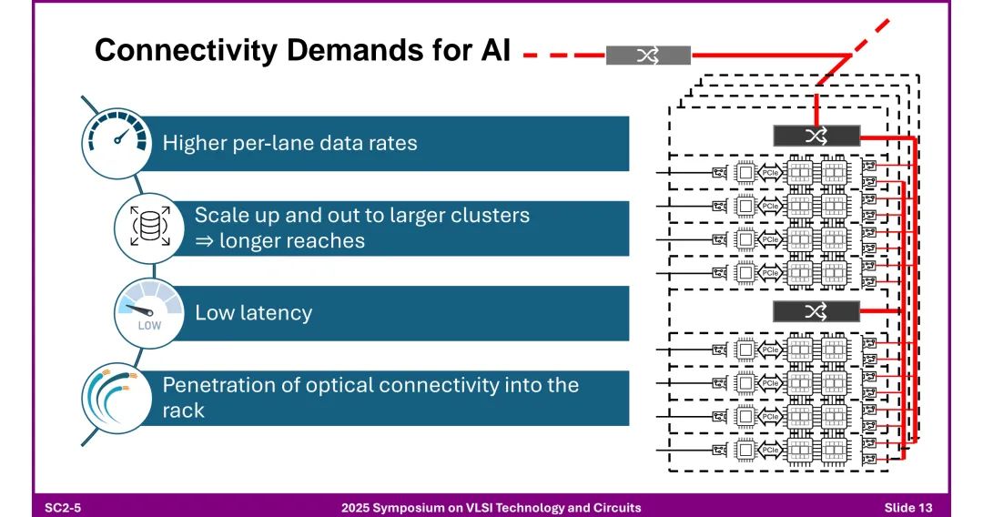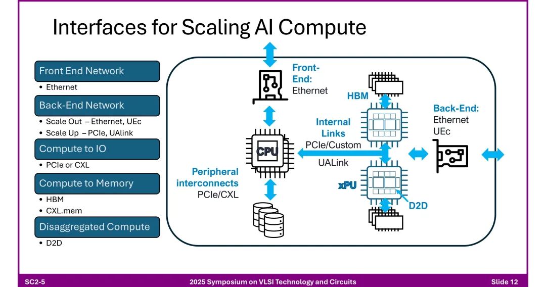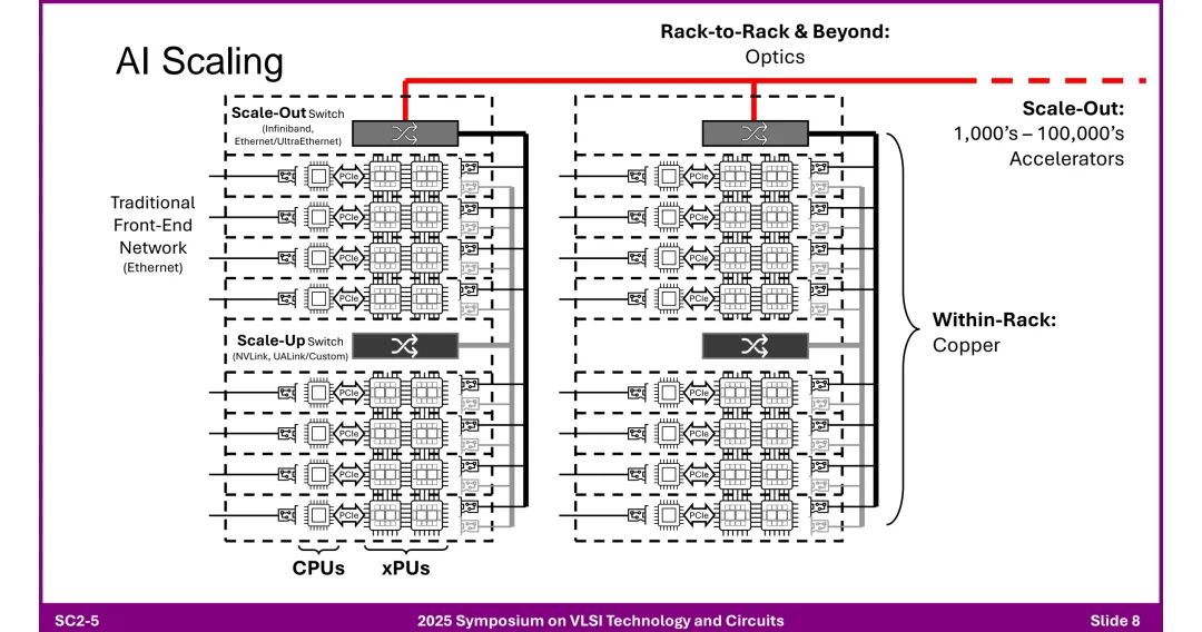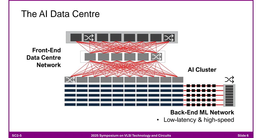 该报告是2025年VLSI会议上Alphawave关于加速AI的连接技术的短课内容,作者为Tony Chan Carsone。该报告指出AI领域呈现数据量与模型参数的爆发式增长,但算力增长远超内存与互连带宽,存在连接瓶颈。为突破瓶颈,AI数据中心采用分层网络架构:前端网络基于以太网,后端网络通过“Scale Up(纵向扩展)”和“Scale Out(横向扩展)”实现集群扩展。其中,机架内连接依赖铜缆及NVLink、PCIe等专用链路;机架间及更远距离(达10公里)则依赖光学技术,如以太网、Infiniband,且随着数据率提升,光学技术正逐步渗透到机架内甚至芯片级。 芯粒架构(Chiplet)成为关键解决方案:相比单片方案(受尺寸限制、良率低、成本高),芯粒架构通过异构集成(如先进逻辑节点与I/O优化节点结合),降低设计时间、风险及成本,支持灵活组合功能。3D芯粒架构进一步整合计算、内存(HBM)与光引擎,通过D2D(芯粒间)接口提升集成度。 高速I/O设计面临多重挑战:包括模拟前端的寄生电容、带宽限制,时钟抖动,以及芯粒实现中电感耦合、电磁仿真复杂度等问题。同时,光学收发器技术持续演进,从传统模块到集成DSP与硅光子技术的光引擎,共封装光学(CPO)虽能降低功耗、延迟,但存在散热集中、维护复杂等问题。 标准体系同步发展:以太网标准(如802.3系列)从40G演进至1.6T,PCIe从1.0升级至7.0,但其3年左右的开发周期需匹配AI硬件12个月的更新节奏。此外,铜互连通过共封装铜(CPC)连接器缓解阻抗不连续问题,400G以上电信号(如PAM-4/6)的可行性依赖FEC与均衡技术优化。 最终,报告强调,面对AI对低延迟、高吞吐量、大规模扩展的需求,需通过电气与光学技术融合、芯粒架构创新、标准协同及跨领域研发合作,推动连接技术突破。