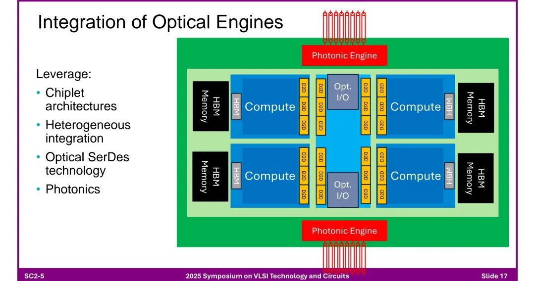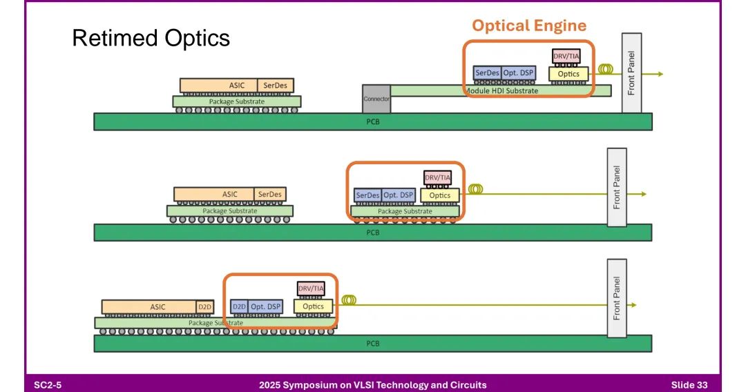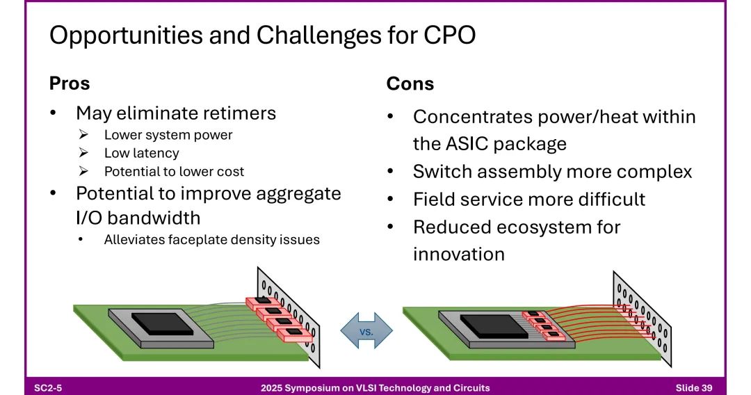 ◆ 优势:消除重定时器、降低功耗、低延迟、提升带宽密度、缓解面板接口限制。 ◆ 挑战:封装内热量集中、组装复杂、现场维护困难、生态系统创新受限。