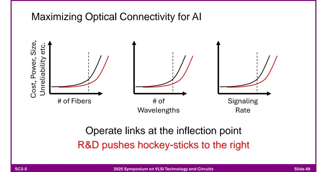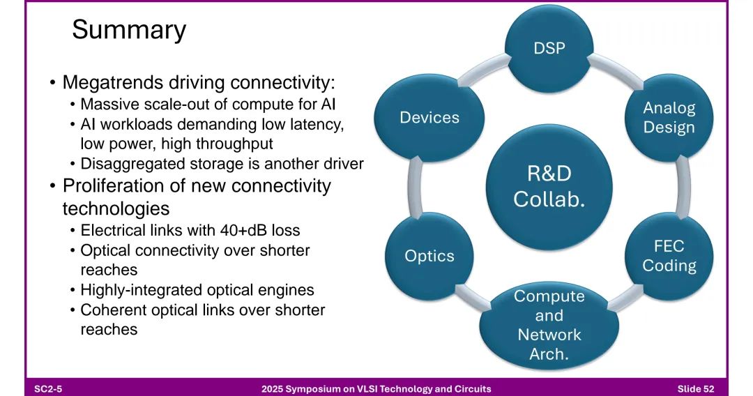 1. 核心驱动因素 - AI计算大规模扩展、低延迟/低功耗/高吞吐量需求、分布式存储普及。 2. 关键技术趋势 - 电气链路:支持40+dB损耗,依赖先进均衡与调制技术。 - 光学链路:向短距离渗透,集成光引擎与芯粒,相干技术下沉。 - 架构创新:芯粒异构集成、3D堆叠、CPO成为主流。 3. 研发协作需求 - 需跨领域协同(DSP、模拟设计、光学、封装、编码、网络架构等),推动技术突破以匹配AI算力增长速度。