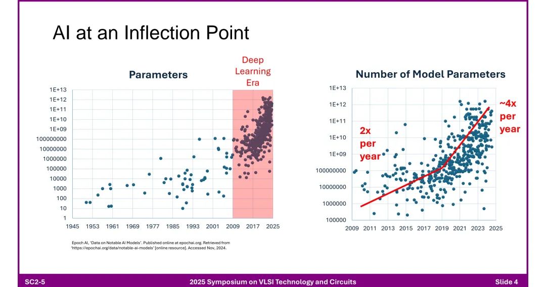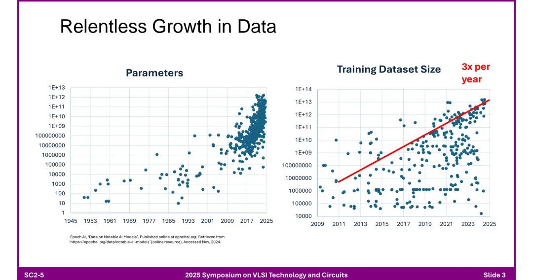 一、AI数据中心的核心趋势与挑战 1. 数据与模型参数的爆炸式增长 ◆ 训练数据集规模:从1945年到2025年呈现指数级增长,年均增长率达3倍,2025年规模接近1E+14(数据来源:Epoch AI)。 ◆ 模型参数增长:进入深度学习时代后(2009年后),参数数量增速显著提升,每2年约增长4倍,2025年突破1E+13,远超此前增速(此前约每2年增长2倍)。